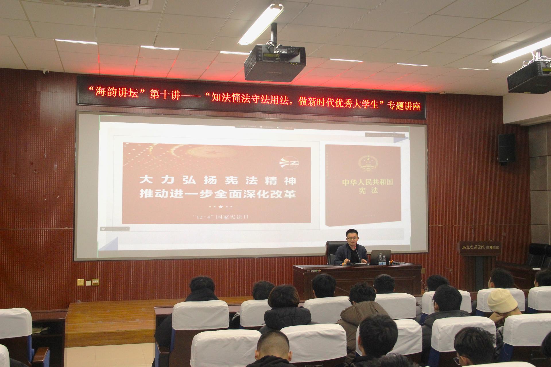 船舶与港口工程学院在威海校区第二报告厅举办“知法懂法守法用法,做新时代优秀大学生”讲座,邀请威海市环翠区司法局副局长褚衍文担任主讲嘉宾。褚衍文围绕宪法知识、大学生常见违法行为及预防措施等内容为同学们宣讲,他鼓励学生要知法、懂法、守法、用法,争做新时代优秀大学生。讲座结束后,储衍文走进学院“一站式”学生社区,与同学们围绕“东西方法律文化的差异”展开交流,他从法律对社会秩序的意义、东西方法系特点、陪审团运作机制等方面帮助学生了解东西方法律文化差异,引导学生增强走中国特色社会主义法治道路的自信和自觉。