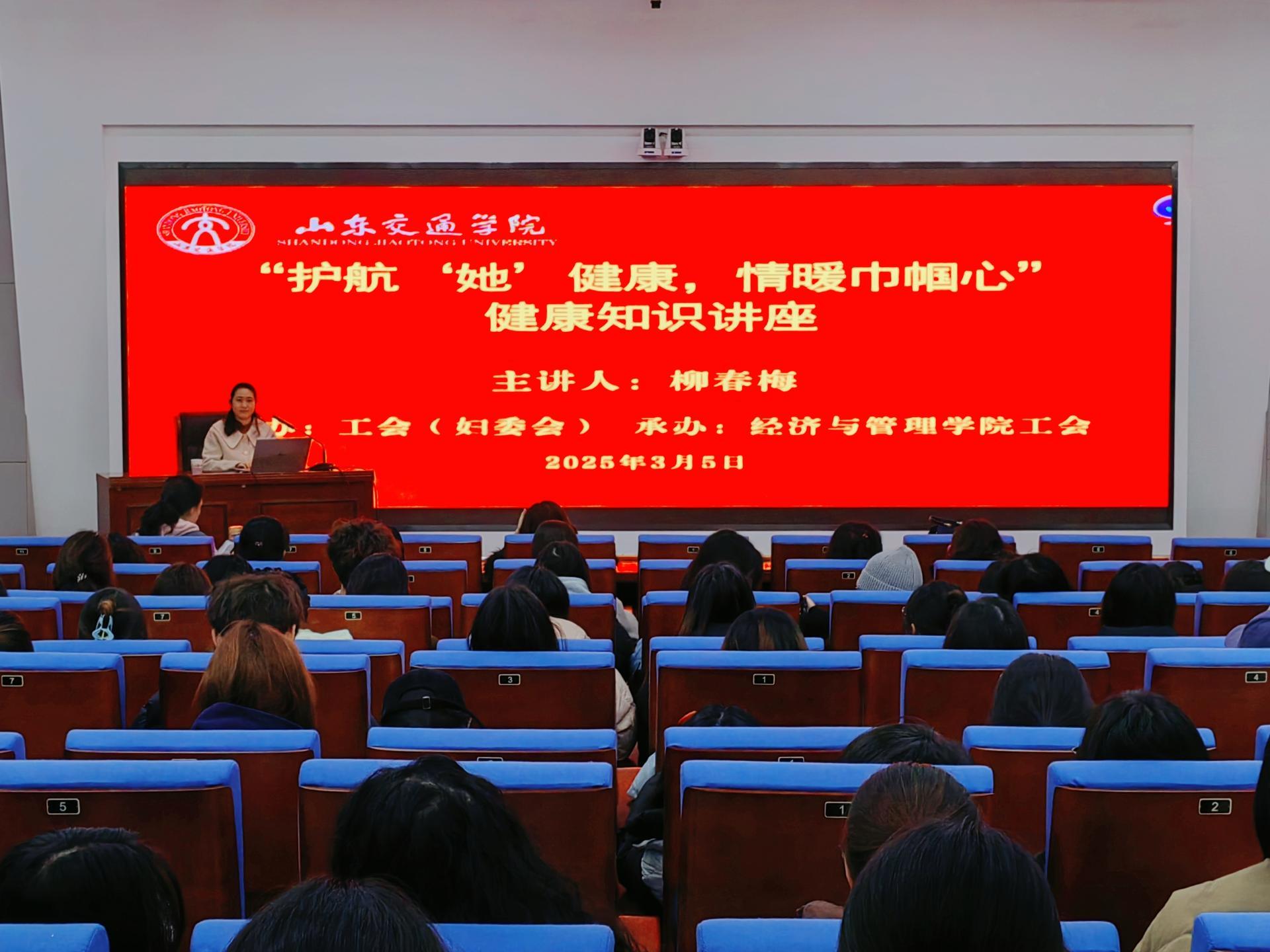 学校工会(妇委会)在长清校区机电楼B107会议室举办“护航‘她’健康 情暖巾帼心”健康知识讲座。讲座由经济与管理学院工会(妇委会)承办,学院工会(妇委会)主席王莉主持活动,全校200余名女教职工、女学生参加活动。活动邀请济南市第四人民医院中医科副主任柳春梅讲授《女性养生智慧》。柳春梅以中医养生理论为基础,结合现代医学知识,通过案例分析、现场演示穴位按摩等互动方式,生动普及“治未病”理念,倡导“因时择食、因人施养”的健康生活方式。讲座结束后,柳春梅进行现场互动,耐心解答大家关心的健康问题。