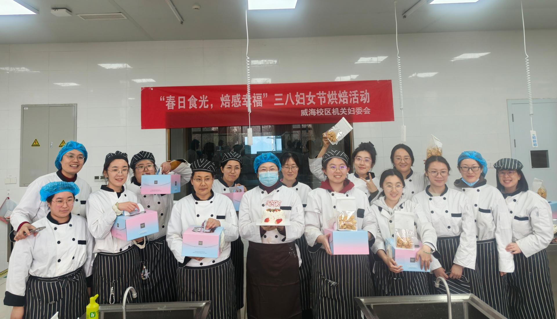 威海校区机关工会(妇委会)举办“春日食光,焙感幸福”烘焙活动。活动现场气氛热烈而温馨,女教职员工们先后体验了黄油曲奇、水果奶油蛋糕及饼干的制作过程,并围绕原材料准备、成品的装饰等方面相互交流制作心得,为自己送上一份特别的节日祝福。